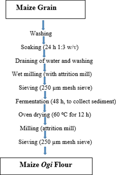 Ogi was processed according to the modified method of Chike and Onuoha [18] as shown in Figure 2. Maize grains were obtained, sorted to eliminate the bad grains, cleaned to remove debris and foreign materials, and steeped in clean tap water for 24 h at room temperature. The steeped grains were then washed with clean water, wet-milled using a commercial maize mill, and wet-sieved using a 250 μm sieve. The husks were disposed of while the filtrate (slurry) was allowed to ferment for 48 h. At the end of the fermentation period, the ogi was recovered by using a cheese cloth to squeeze out the water. The wet ogi sample was then dried in an oven (60 °C, 12 h). The dried starchy cake obtained was milled and sieved to obtain ogi flour.