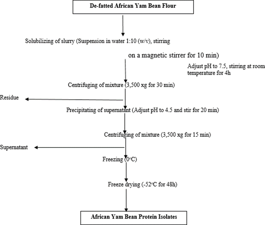 African yam bean protein isolates were extracted from defatted African yam bean flour using a modified isoelectric precipitation procedure as described by Gbadamosi et al. [21]. The defatted flour was dispersed in distilled water at a 1:10 (w:v) ratio. This was followed by an adjustment to pH 7.5 with 1.0 M NaOH to solubilize the protein. The resulting mixture was stirred using a magnetic stirrer for 4 h and centrifuged at 3,500 xg for 30 min. The residue was discarded, and the supernatant was filtered with cheesecloth and adjusted to pH 4.5 using 1.0 M HCl to precipitate most of the proteins. Thereafter, the mixture was centrifuged (3500 x g, 30 min). The resultant precipitate was redispersed in 25 ml of distilled water, frozen at 0 °C, and then freeze-dried at -52 °C to yield a free-flowing powder. The African yam bean protein isolates were stored in a sealed tube at 4 °C until analyzed. The flow chart for the processing of African yam bean protein isolates is shown in Figure 4.