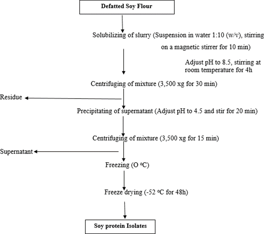 Protein was extracted from defatted soy flour using a modified isoelectric precipitation procedure as described by Gbadamosi et al. [21]. The defatted flour was dispersed in distilled water at a 1:10 (w:v) ratio. This was followed by an adjustment to pH 8.5 with 1.0 M NaOH to solubilize the protein. The resulting mixture was stirred using a magnetic stirrer for 4 h and centrifuged at 3,500 xg for 30 min. The residue was discarded, and the supernatant was filtered with cheesecloth and adjusted to pH 4.5 using 1.0 M HCl to precipitate most of the proteins. Thereafter, the mixture was centrifuged (3500 x g, 30 min). The resultant precipitate was re-dispersed in 25 ml of distilled water, frozen at 0 °C, and then freeze-dried at -52 °C to yield a free-flowing powder. The soy protein isolate was stored in a sealed tube at 4 °C until analyzed. The flow chart for the processing of soy protein isolates is shown in Figure 5. The blend formulation is presented in Table 1.
