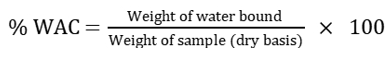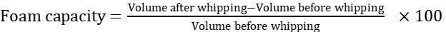 Foaming capacity was determined by the method of Onwuka [22]. One gram of each sample was blended with 50 mL of distilled water and whipped for 5 minutes at 1600 rpm. The whipped mixture was transferred into a 250ml measuring cylinder, and the volume was recorded after 30 seconds. Foam capacity was expressed as a percentage increase in volume using the formula below.