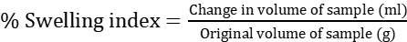 The swelling index was determined using the method of Onwuka [22]. Five grams’ portion (dry basis) of each sample was transferred into clean, dried graduated (50ml) cylinders. The samples were gently levelled and the volumes noted. Fifty millilitres of distilled water was added to each sample. The cylinder was swirled and allowed to stand for 60 minutes while the volume change (swelling) was recorded every 15minutes. The ratio of the initial volume to the final volume gave the swelling index.