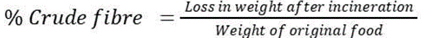 The method described by AOAC [24] was used for fibre determination. Two (2) grams of the sample were extracted using diethyl ether. This was digested and filtered through the California Buchner system. The resulting residue was dried at 130 ± 2 °C for 2h, cooled in a desiccator, and weighed. The residue was then transferred into a muffle furnace (Shanghai box type resistance furnace, No.: SX2-4-10N) and ignited at 550 °C for 30 min, cooled, and weighed. The percentage crude fibre content was calculated as: